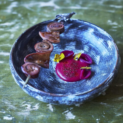 • Serve the meat on a kebab stick with the warm beetroot purée. This can be enjoyed on its own or served with cooked beetroots as a main course dish.
