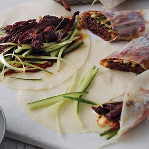 You can either serve all the ingredients separately to let everyone enjoy making their own pancakes (as pictured), or you can make up the pancakes beforehand by placing a little of the meat onto the pancake and topping it with the sliced cucumber and spring onions. You can also serve the pancakes with a splash of the Hoisin sauce.
