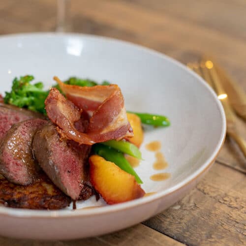 Grouse breasts with a potato rosti, roasted plums & bacon