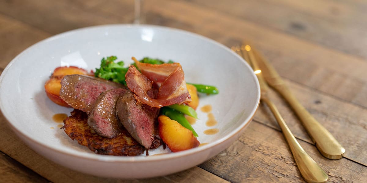 Grouse breasts with a potato rosti, roasted plums & bacon