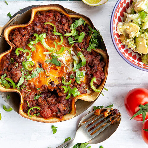 • Lightly oil 4 small frying pans and lay the tortillas into them. Divide the meat mixture evenly between the pans making a hollow in the centre. Break an egg into each hollow and scatter with some grated Cheddar. Place in the oven for 8-10 minutes until the eggs are nearly cooked. Alternatively, place the meat in a shallow casserole, make 4 hollows in the top of the mixture, break in the eggs and bake in the oven for 8-10 minutes. Once the eggs are nearly cooked, remove from the oven, scatter some coriander leaves over and serve with warm tortillas on the side.