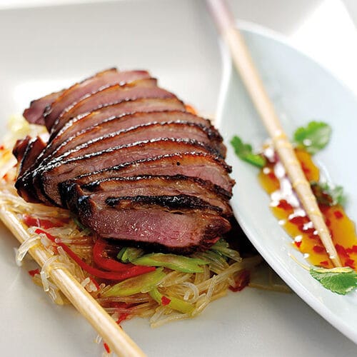 • Cook for 4 minutes on the other side, then remove form the pan and allow to rest for 4 minutes. In the same pan fry off the red pepper for 5 minutes then add the spring onion and cook for a further 2 minutes. Add 50 ml of sweet chilli sauce and the noodles and sauté well. Place a portion of noodles on the plate, thinly slice the duck then lay it on the noodles and enjoy.