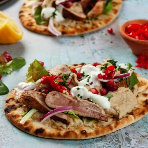 Partridge shawarma with flatbread, warm hummus and pickled red onion