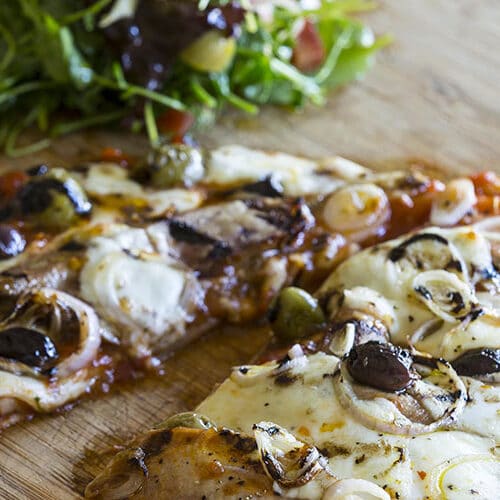- Top the pizza with grated parmesan and the olives, drizzle with pesto and balsamic vinegarPlace the pizza either straight onto the shelf or on a pizza tray and cook for 18mins until the top is golden brown.Serve with a nice mixed salad