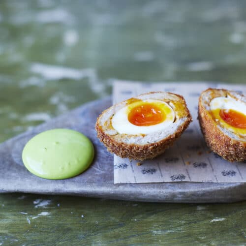 Nothing beats a warm Scotch egg served fresh out of the oven. If you can’t get hold of pheasant eggs, simply use normal free-range chicken eggs and cook them for a minute longer. Wild garlic can be substituted with any other green herb.