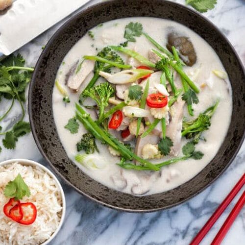 • If the soup is too thick, add more coconut milk or water. Add the fish sauce, brown sugar, lime juice and red chillies. Taste for seasoning and add some sea salt if necessary. There needs to be a balance of sour and salty flavours.