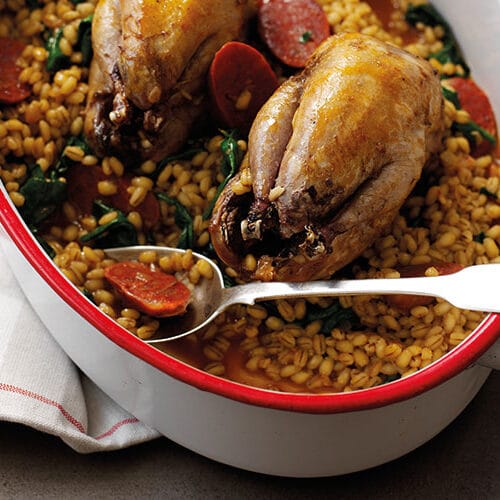 - Once cooked, remove the partridges from the pearl barley and stir in the spinach so that it wilts and mixes well. Season, serve and enjoy.