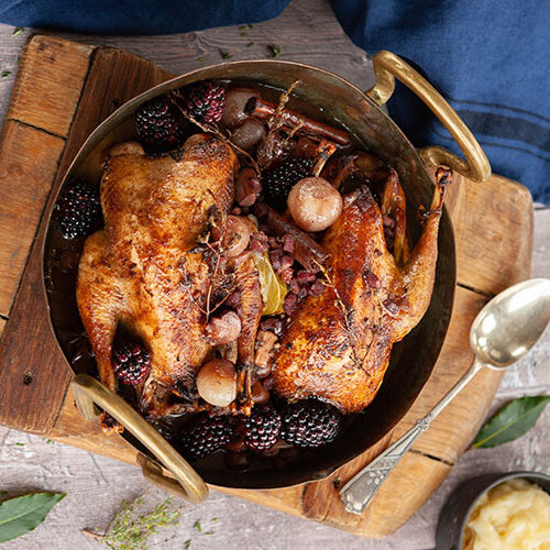 Pot roasted pheasant with mulled wine, shallots, bacon and blackberries