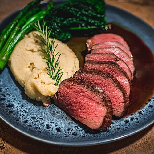 - When ready to serve, slice the venison rump into ½ to 2-centimetre- thick slices.