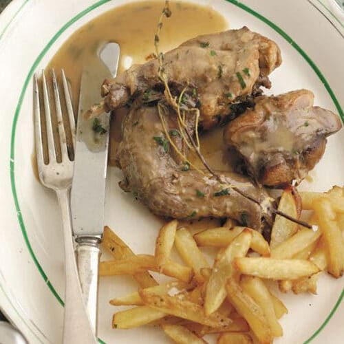 A simple rabbit dish in white wine and garlic. We recommend it is served with French fries