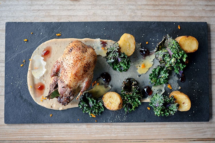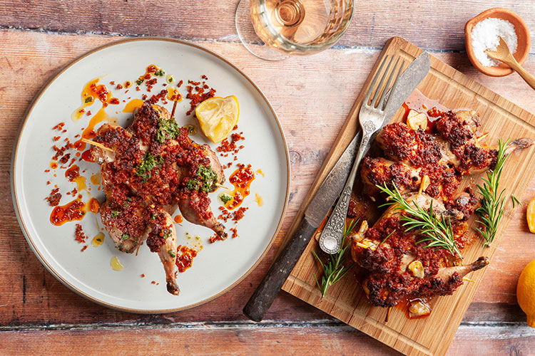 Roast spatchcock partridge, n’duja, lemon and herb crumbs