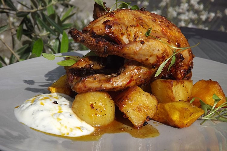 Harissa spiced partridge with fragrant spiced potatoes and squash