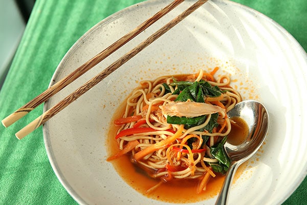 Korean spiced rabbit legs with rice noodles