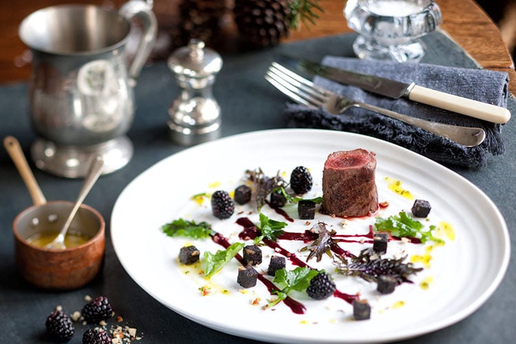 Venison with Blackberries & Warm Salad of Black Pudding, Wild Mushroom & Kale