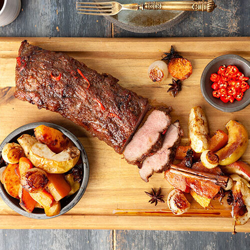 • Allow the boar loin to rest for 10 minutes then carve and serve with the roasted vegetables and roasting juices. Delicious with roasted potatoes or steamed rice.