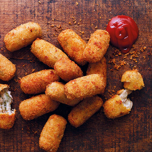 Place each of the mix pieces onto a flour-dusted table and roll them into croquet shapes. Dip thoroughly in egg and then cover evenly in breadcrumbs.
