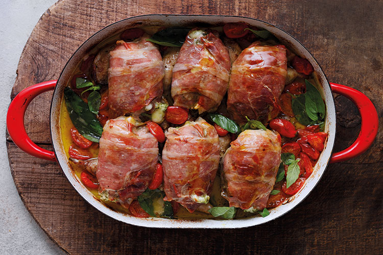 - Slice the mozzarella into six even slices and all the tomatoes in half. Now, on a flat surface, lay three slices of the ham so they overlap, place one partridge breast on top and then add a slice of mozzarella a good spoonful of the pesto. Place another breast on top and wrap the ham around the breasts, keeping the joining on the bottom. Repeat with the rest of the breasts.