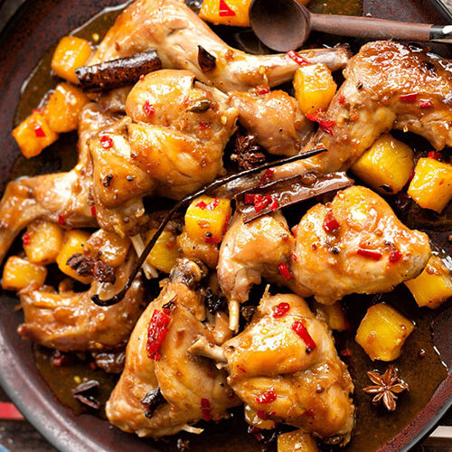 - To make the sauce, put the vinegar and sugar in a saucepan and heat over a medium heat to a light caramel colour. Add the soy sauce, chilli, ginger, tamarind paste, star anise and pineapple and cook for a further 2 minutes. Stir in the reduced rabbit stock and cook for another 2 minutes.