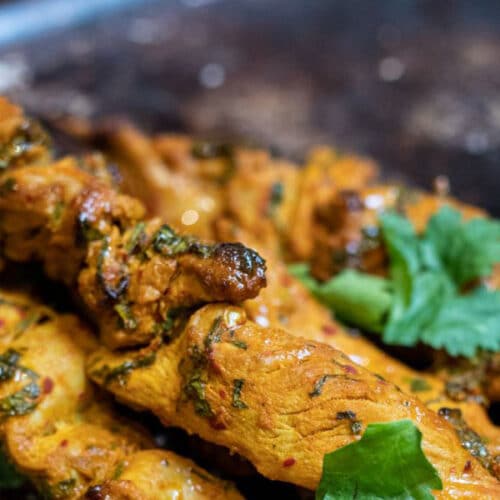 - Place the skewers evenly on a solid metal tray and carefully place under the grill. Turn as they begin to colour and cook for 5 minutes in total until the juices run clear from the meat.