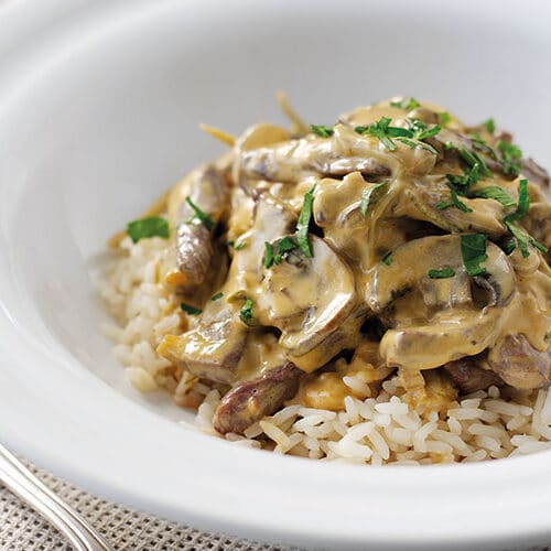 • Once the sauce is at the right consistency, add the meat and stir well. Cook for a further 5 minutes then add the gherkins, stir, correct seasoning and serve with rice or pasta, garnishing with a little chopped parsley