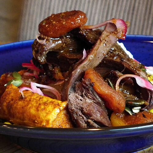 - When the meat and vegetables are nicely browned add apricots, sugar, vinegar, wine and butter with a small glass of water and chopped coriander stems.Cover tightly with baking paper and tin foil and cook for 4 hours at 130c. Do not leave any gaps in the foil or the meat will dry out.