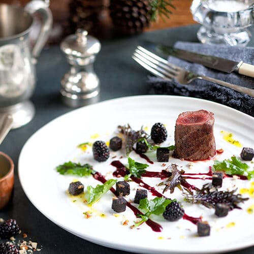 - Scatter the salad around the plate, carve the venison and place on one side of the plate, drizzle some of the blackberry puree around and finish with the rest of the dressing.