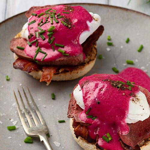 - Place a rasher of bacon, cut in half, on each muffin half and top with 2 sliced pigeon breasts. Top with a poached egg and finally spoon the beetroot hollandaise over the egg. Sprinkle with some chopped chives. Repeat with the remaining muffins. Serve 2 muffin halves per person.